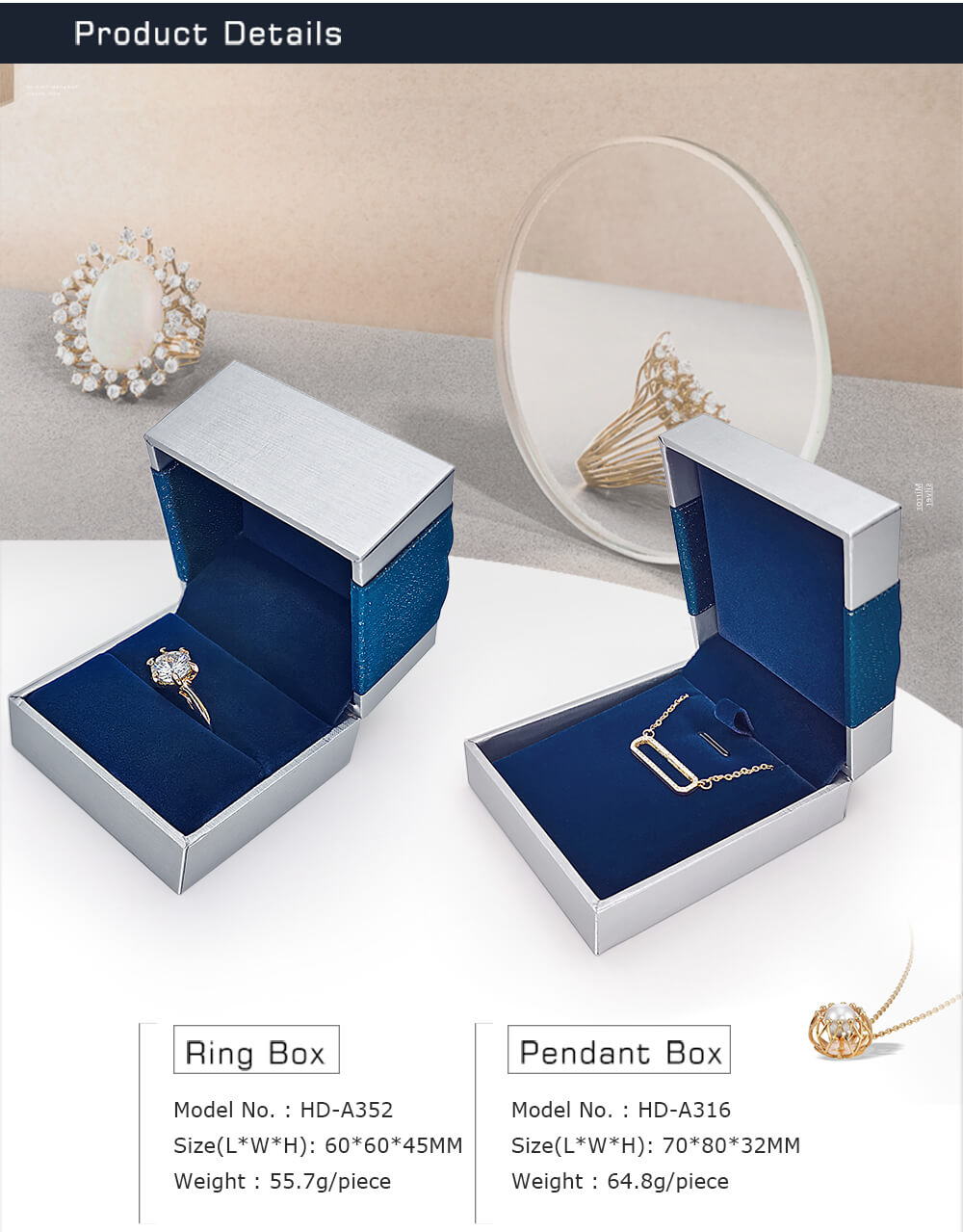 For this jewelry box, we chose high-end environmentally friendly twill paper as the packaging material of the outer jewelry box, and high-end velvet material as the inner lining material. We cooperate with our company‘s skilled senior craftsmen with more than 10 years of production experience to ensure the quality and beauty of the products.