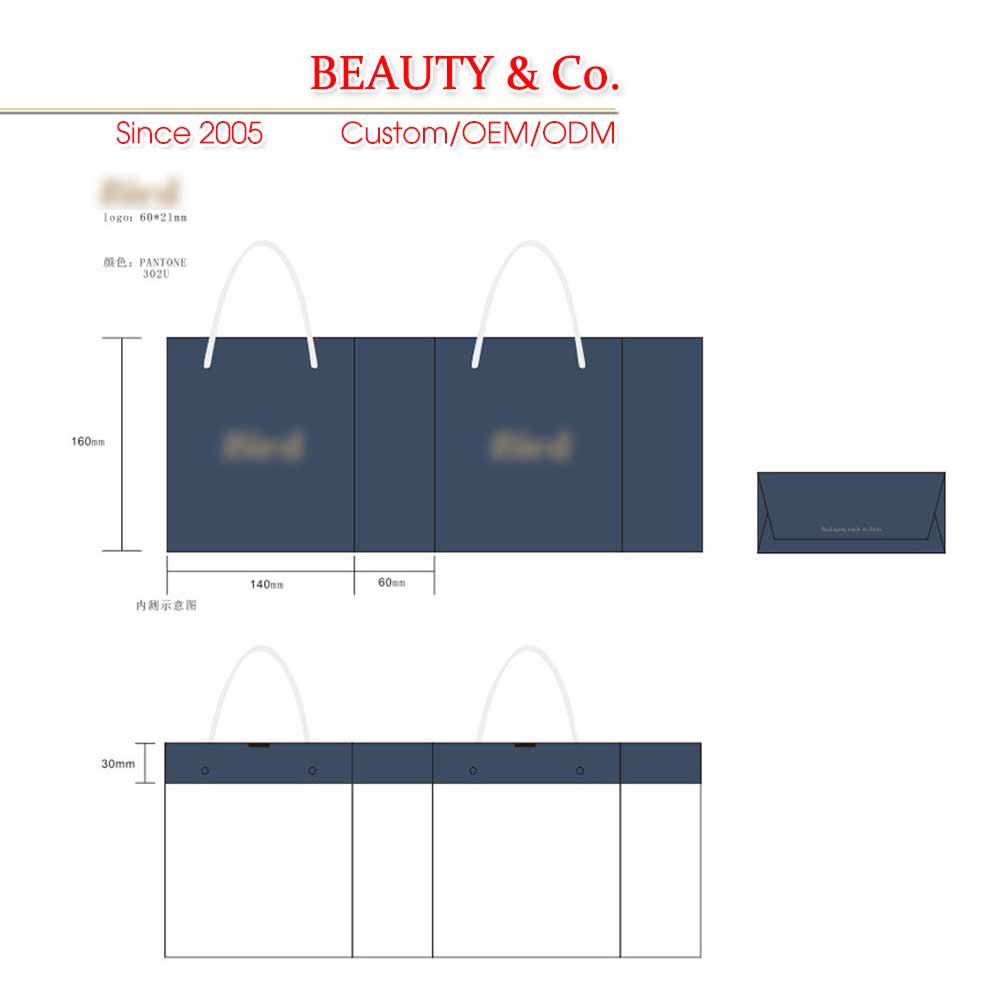 Our paper bags are environmentally oriented and made from recyclable paper materials. Small size is with 210gsm white card, big size is with 230gsm white card, No pollution to the environment. Paper bags can be reprocessed into paper or cardboard materials. Outside of the paper bag is with grid-textured to avoid obvious scratch mark.
