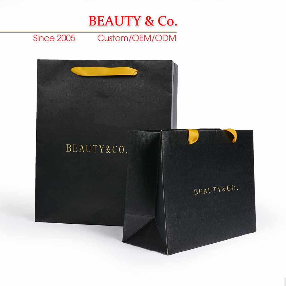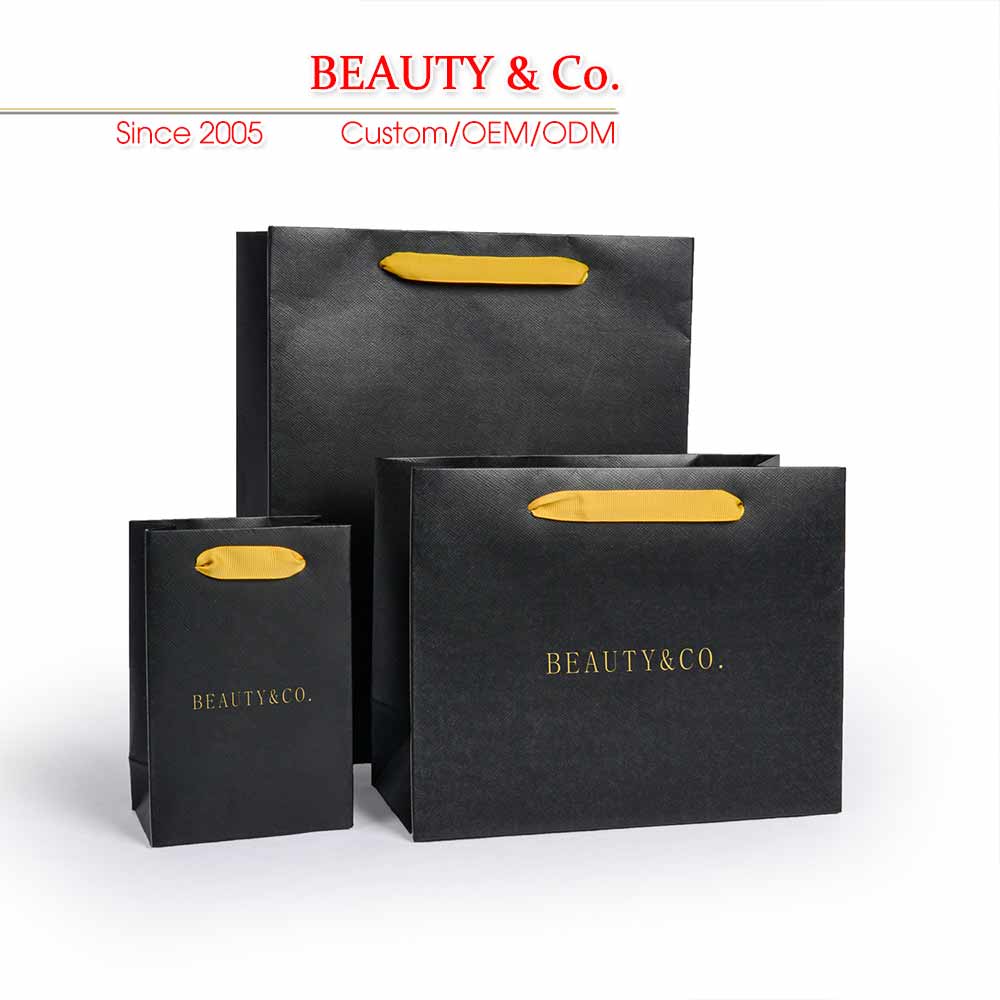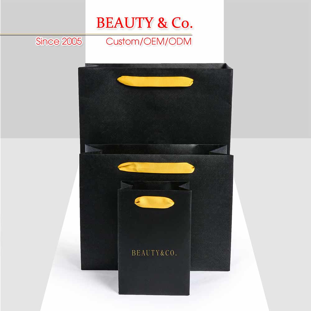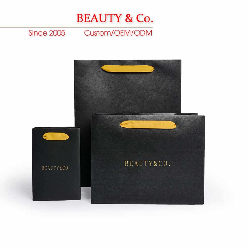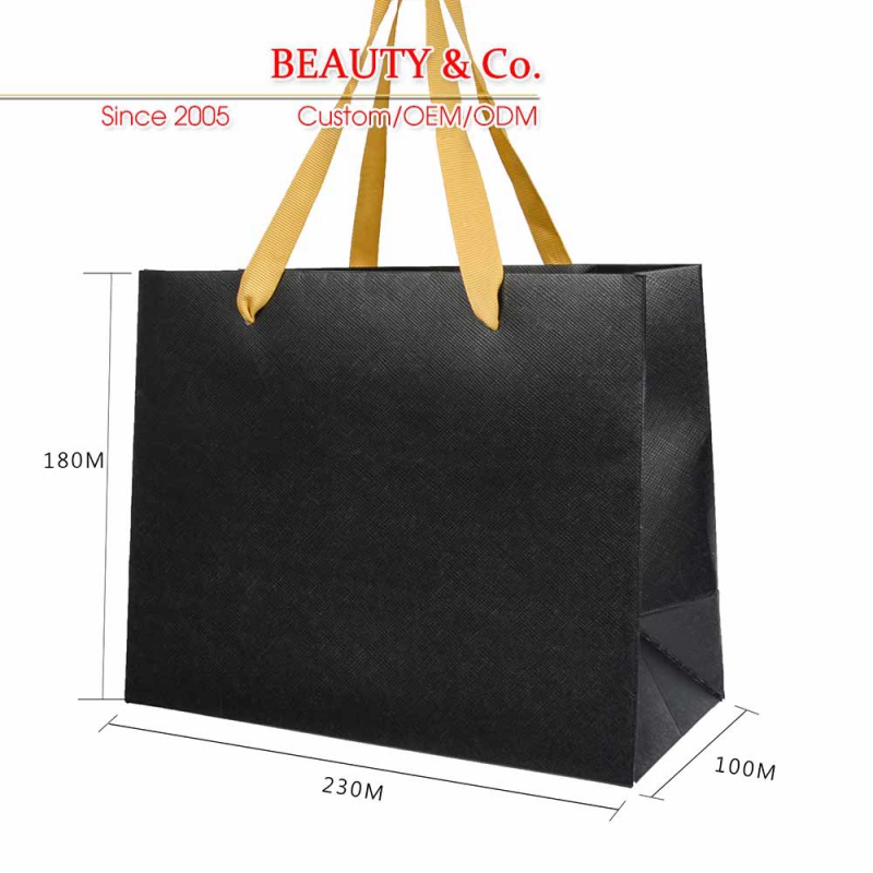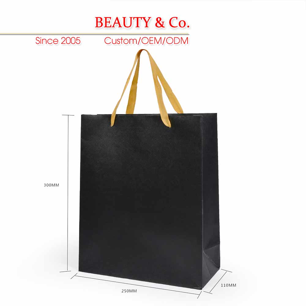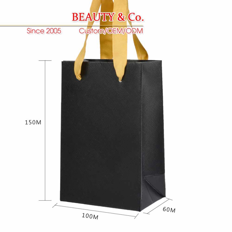 Our paper bags are environmentally oriented and made from recyclable paper materials. Small size is with 210gsm white card, big size is with 230gsm white card, No pollution to the environment. Paper bags can be reprocessed into paper or cardboard materials. Outside of the paper bag is with grid-textured to avoid obvious scratch mark.