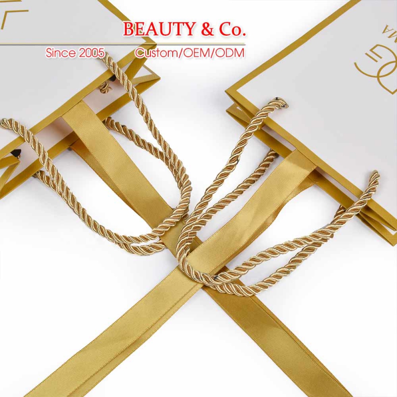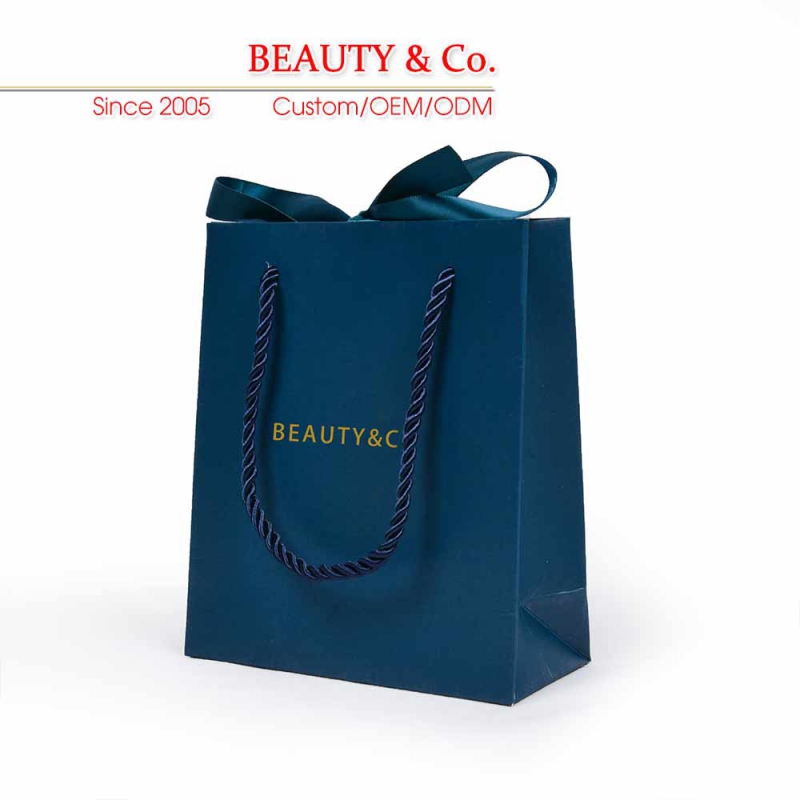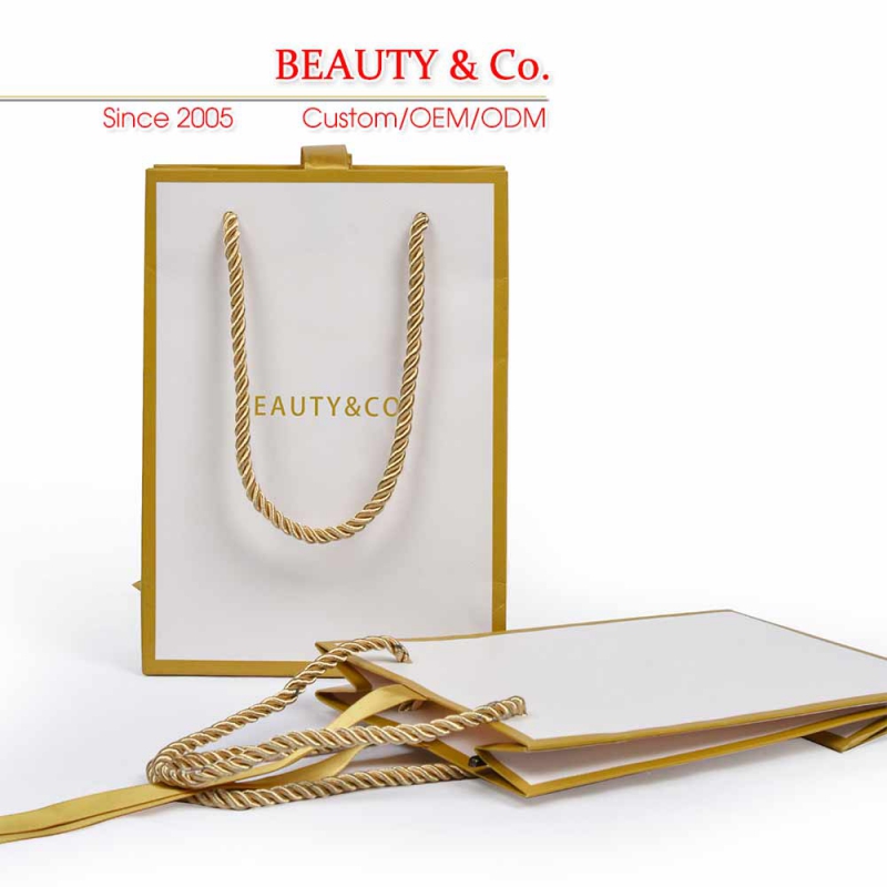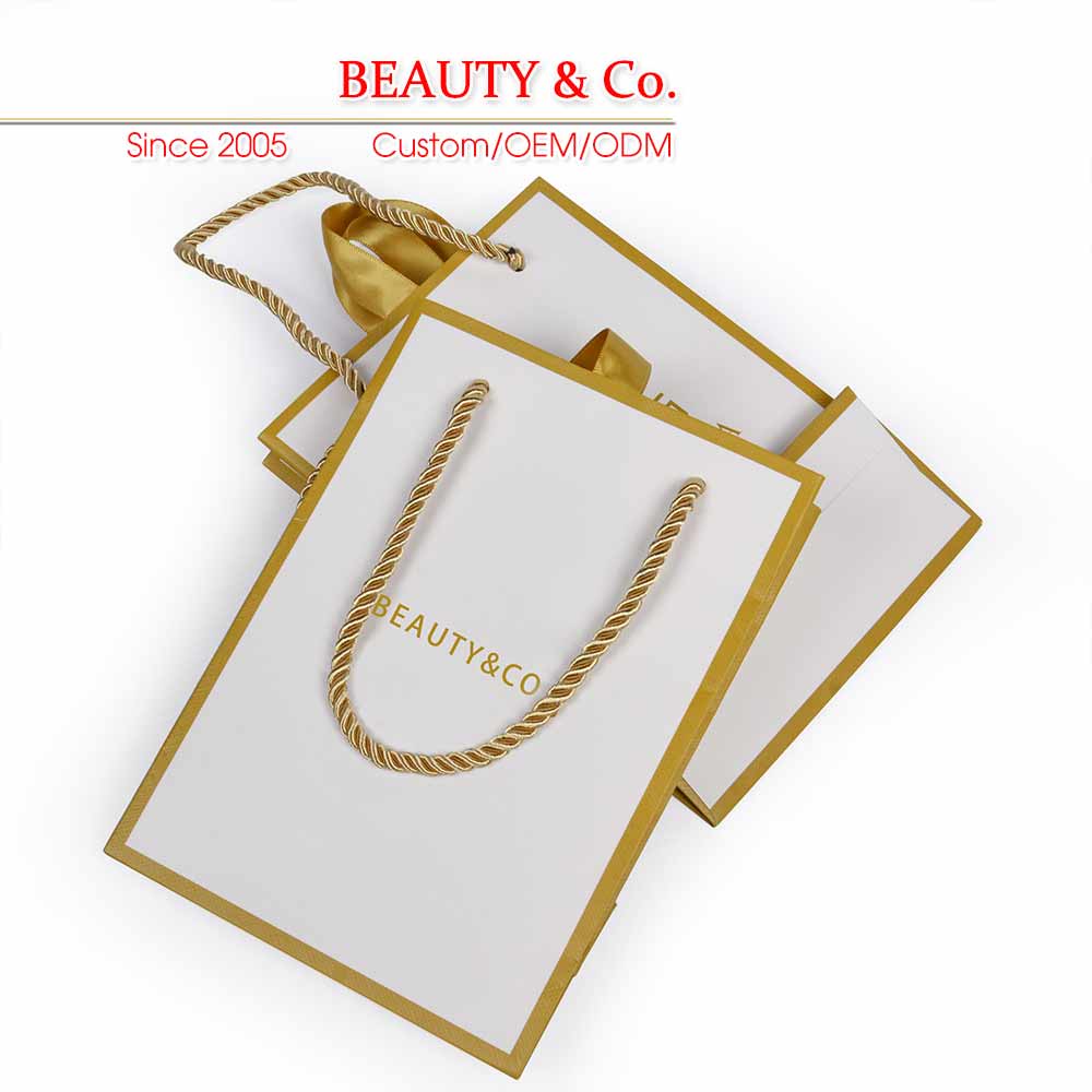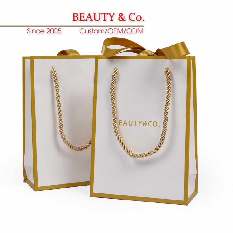 Our paper bags are environmentally oriented and made from recyclable paper materials. Small size is with 210gsm white card, big size is with 230gsm white card, No pollution to the environment. Paper bags can be reprocessed into paper or cardboard materials. Outside of the paper bag is with grid-textured to avoid obvious scratch mark.