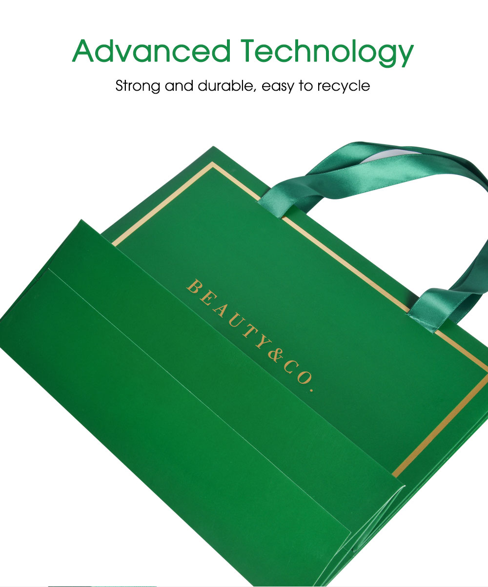 Our paper bags are environmentally oriented and made from recyclable paper materials. Small size is with 210gsm white card, big size is with 230gsm white card, No pollution to the environment. Paper bags can be reprocessed into paper or cardboard materials. Outside of the paper bag is with grid-textured to avoid obvious scratch mark.