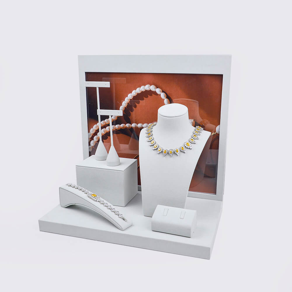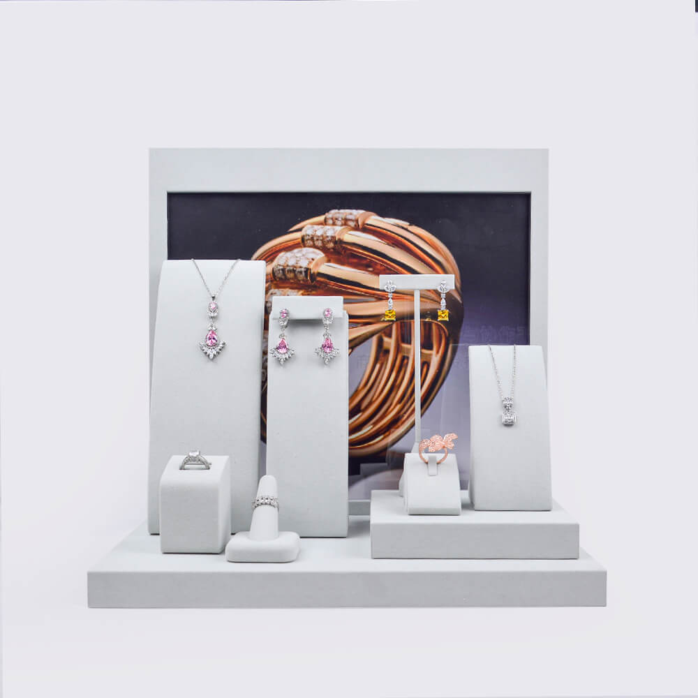We have designed hundreds of elements so that customers can match the jewelry store display they want according to their own ideas. We will also provide customers with professional and effective suggestions so that customers can better choose the products they want. This product involves the matching of high, medium and low-end elements such as ring holders, earring holders, pendant holders, bracelet holders, bracelet holders, etc., as well as the selection and matching of back plates. We carefully selected the high-end microfiber materials on the market to make this product. The characteristics of the microfiber material can ensure that this jewelry display product will last for many years without breaking.